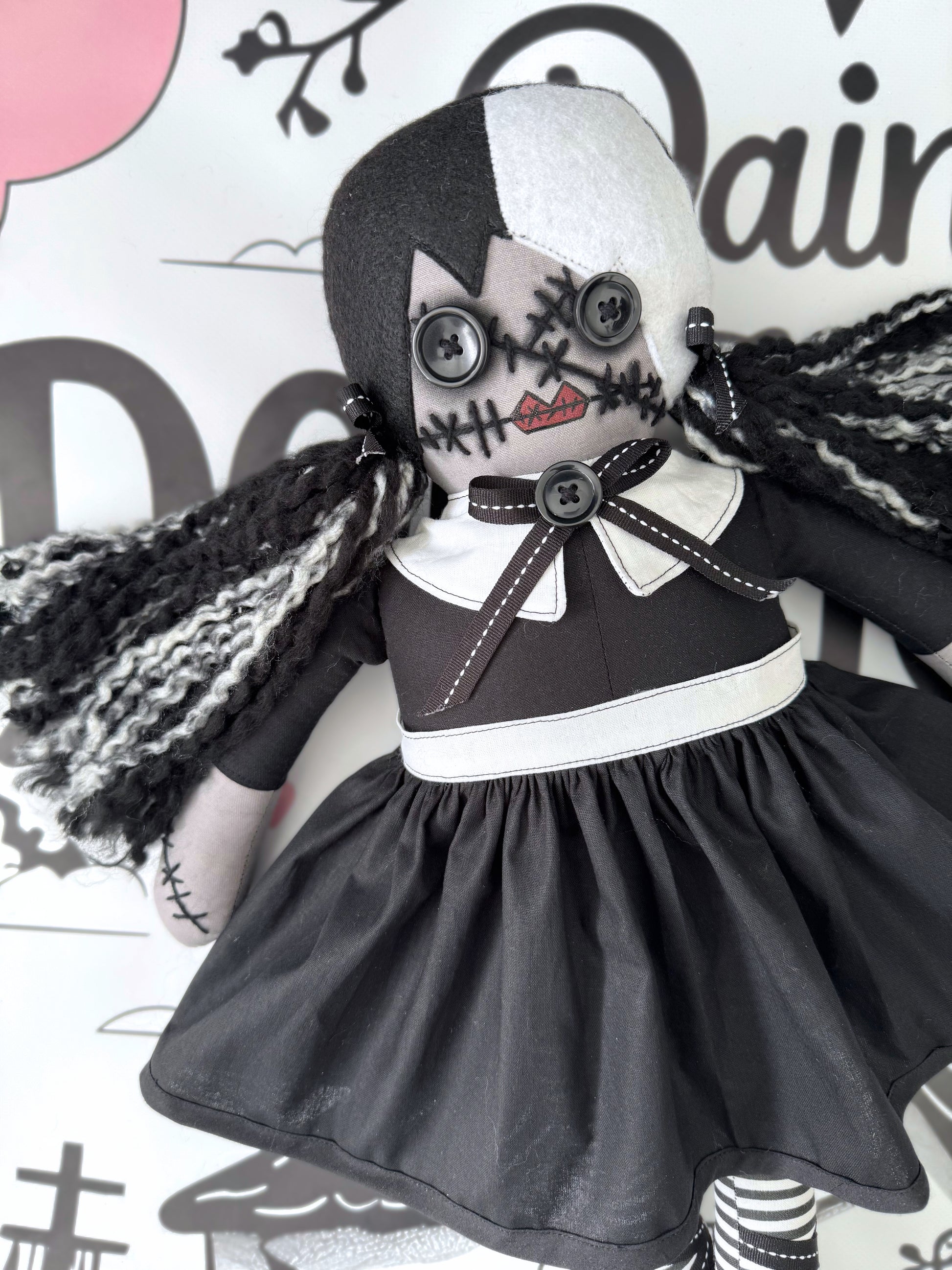 Meet Raven, a lovingly handmade spooky-themed doll created for those who adore the eerie, the gothic, and the beautifully strange.