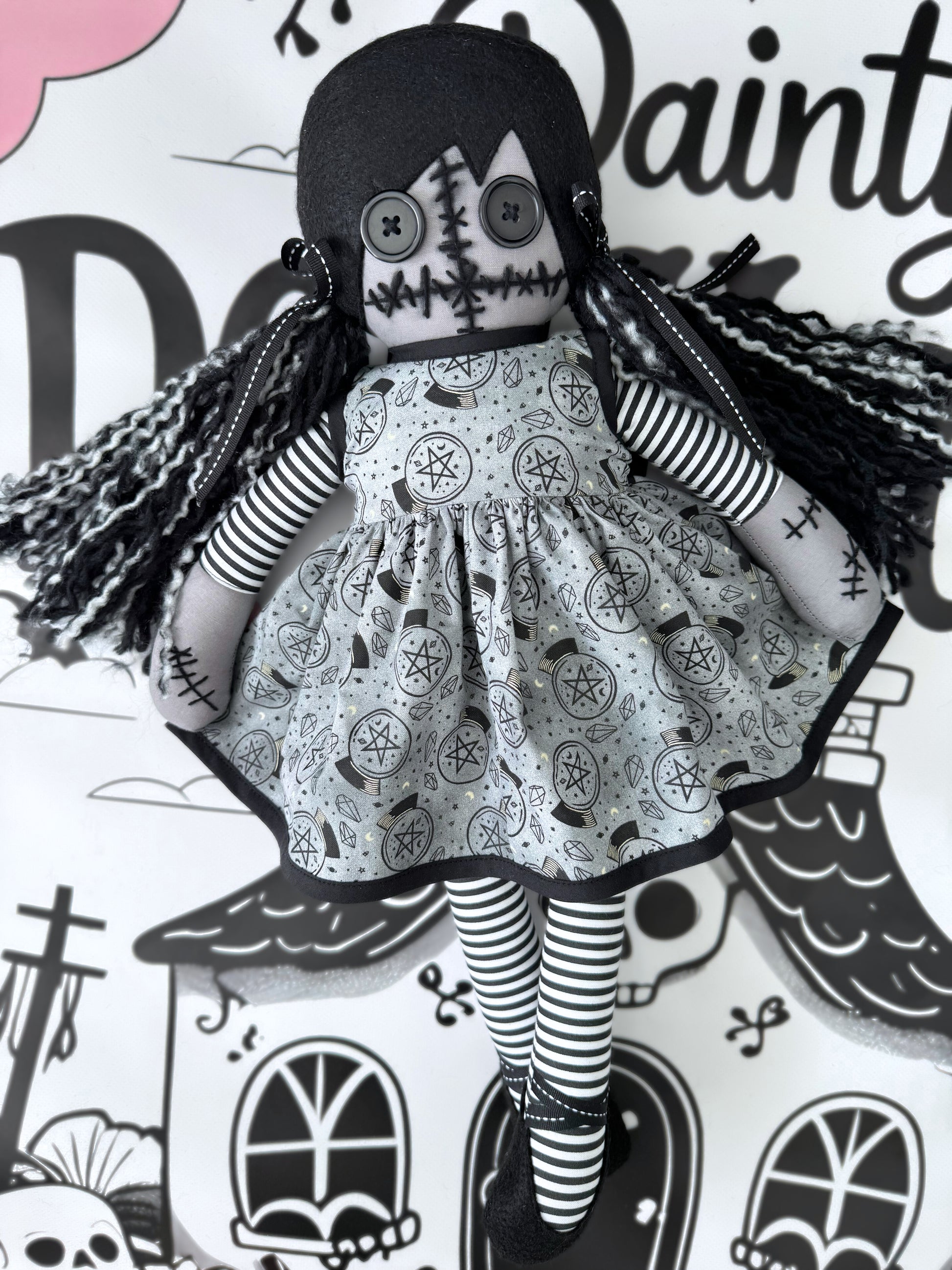Meet Salem, a lovingly handmade spooky-themed doll created for those who adore the eerie, the gothic, and the beautifully strange.